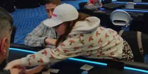 Tilly在桌上也很凶,好几次用边缘牌做很大的翻前加注。在当晚最具娱乐性也是最大的一个底池中,Persson转牌圈在6♥ 8♠ 2♥ 9♥公共牌面用9♦ 6♦下注7000美元,但他的两对只剩四张补牌,因为底牌为K♥ 7♥的Hanks已经拿到同花。