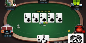 公共牌A♠9♣2♦K♠J♠,yiliuqi幸运的河底中花顺利击败对手三条A,一举收下70.08BB,瞬间码量大幅领先场上所有玩家,一路压制直到获得冠军!
