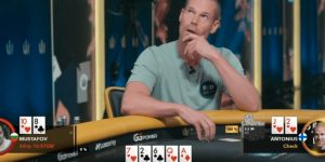 当河牌让对手的同花完成,对手大尺寸下注的话,小盲位直接弃牌就可以了。如果河牌没有让对手完成同花,小盲位可以跟注,但这时候对手能打败小盲位的牌型组合实在是太多了,小盲位应该克制自己,选择放弃。虽然暗三是非常强的牌,但不代表它每一次都很强,在这手牌的情况之中,暗三很有可能是被碾压的。