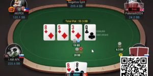 这时候注意,你对手的范围里几乎没有任何顺子的组合。如果他会弃掉所有比三条小的牌,他在这里无论拿着什么牌都会弃掉。