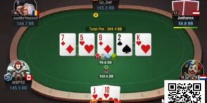 两人打单挑桌都很老练,反复拉扯了一个多小时,当盲注涨到全场记分牌不足40BB时,两人终于打了一个大池。