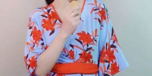 身著旗袍,戴著翡翠項鍊和手串的楊小娟站在一旁與鮮花合影,
