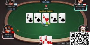 所有同花听牌都错过了,这意味着河牌的9♠几乎就是一块搬砖。只有包括9♦的同花听牌才有所提升。