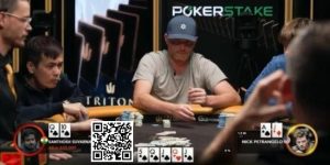 翻前意大利职牌Andrea Dato在HJ位上加注到20万之后,BB位的顾悦凡跟注。做完这个跟注,顾悦凡还剩22.5万的筹码。