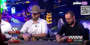 转牌底池约240刀,Clarence这里就可以过牌“控池”再做打算了,底池的筹码已经很多,而翻前的大反加已经可以让我们比较好地筛选出对手的范围,目前我们要么领先(但很容易受牌面影响)、要么已经完全听死,因此我们在这里保护牌力的需求已经很小。过牌后Chris会用他的同花下注100-150刀,面对他的下注,Clarence应该尊重对手的下注而选择弃牌。不弃牌的话可以再跟注一条街,如果河牌再发出一张♦,我们百分百应该弃牌了;或者说他的行动明显透露出他的牌力(他一定会这么做),我们也可以弃牌,这样就不会输完600刀,而只是输掉120-150刀而已(甚至有些许可能牌局在翻前就结束,那AA就只赢17刀)。
