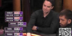 这里要提醒一下读这篇文章的玩家,如果你也打有限德州,请不要在河牌圈扔掉这么强的超强牌,这手牌老邱之所以扔掉主要是因为这是比赛不是常规桌,如果是常规桌,即时读牌那么准也要跟注,因为底池已经那么大,就算是为了看看对手的底牌也是值得的,而比赛的筹码比常规桌金贵,加上小盲位已经全下,所以老邱不跟注也能看到白人的牌。