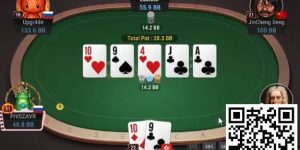虽然Madanzhiev的非全压5bet并不是解算器推荐的最佳选择,但这仍然是一个不错的玩法。这种玩法激励Foxen投入了剩余的所有筹码,进一步放大了他的错误。