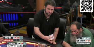 当来到三人对局时,他的计分几乎与开赛时一样,不一样的是,盲注变高了。加之被李靖晶吃掉几个小底池,当关键手牌出现时,杨溢鹏手上仅剩下300万出头。