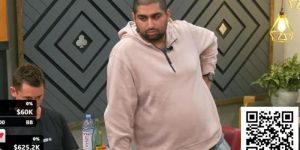 在Q♠7♠5♣的翻牌上双方过牌,转牌J♠出现后Ketola过牌,野人下注120万,Ketola跟注。河牌A♦落下,Ketola直接全下。眼皮沉重的野人扶额沉思,此时服务生上菜,带来片刻轻松。野人啃了口面包棍后毅然弃牌,解说团队瞬间沸腾。